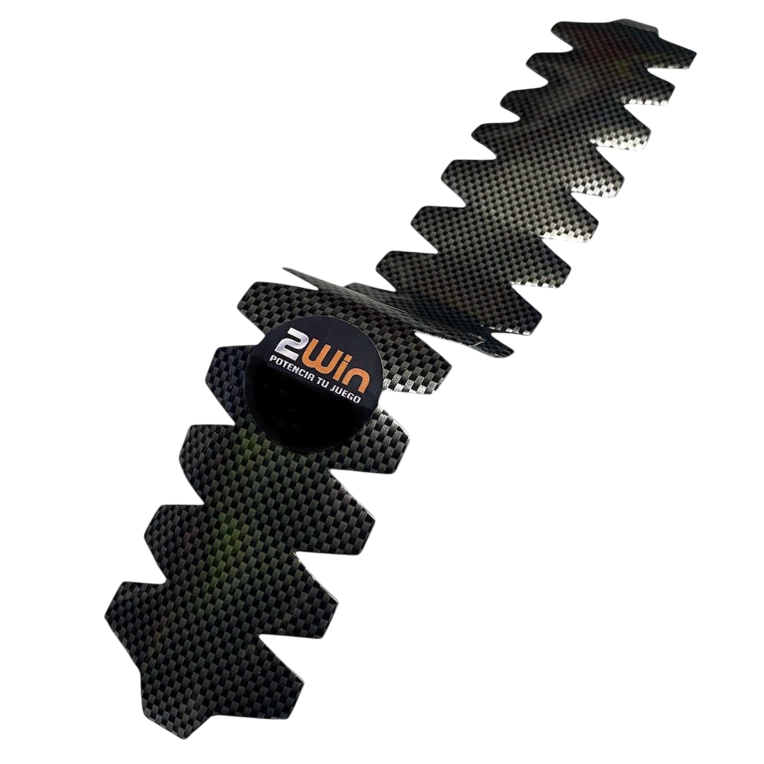 Protector robusto con terminación símil carbono que le aporta un look deportivo y profesional. Su estructura dentada permite un anclaje más firme sobre la paleta, ideal para jugadores que buscan máxima durabilidad frente a roces e impactos.Medidas: 37 cm largo x 4 cm ancho (sin contar las aletas) Espesor: 450 micrones Peso: 11 g aprox